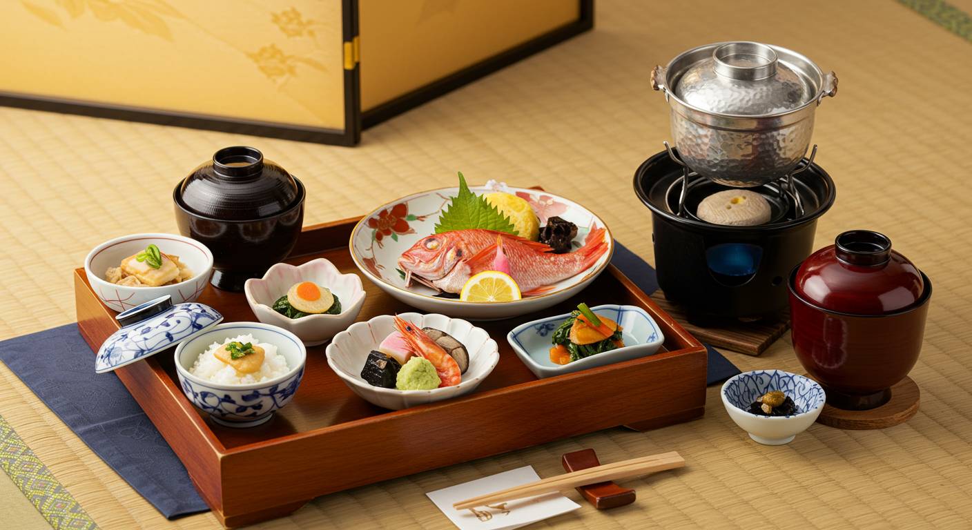 料理は「一汁三菜」を基本に、めでたさを象徴する尾頭付きの鯛、お赤飯、煮物、吸い物などが定番です。特に鯛は「めでたい」という言葉の語呂合わせから縁起が良いとされています。